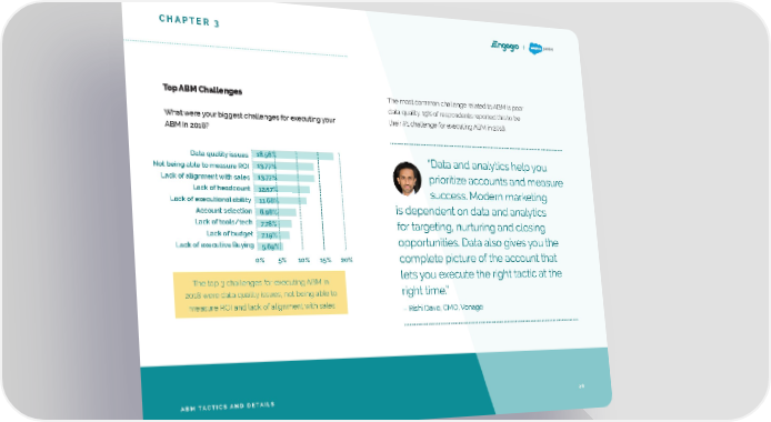 CHAPTER 3 Top ABM Challenges The most common challenge related to ABM is poor data quality. 19% of respondents reported this to be What were your biggest challenges for executing your their #1 challenge for executing ABM in 2018. ABM in 2018? Data quality issues 18.56% “Data and analytics help you Not being able to measure ROI 13.77% prioritize accounts and measure Lack of alignment with sales 13.77% Lack of headcount 12.57% success. Modern marketing Lack of executional ability 11.68% is dependent on data and analytics Account selection 8.98% Lack of tools/tech 7.78% for targeting, nurturing and closing Lack of budget 7.19% opportunities. Data also gives you the Lack of executive Buying 5.69% 0% 5% 10% 15% 20% complete picture of the account that The top 3 challenges for executing ABM in lets you execute the right tactic at the 2018 were data quality issues, not being able to right time.” measure ROI and lack of alignment with sales – Rishi Dave, CMO, Vonage ABM TACTICS AND DETAILS 26