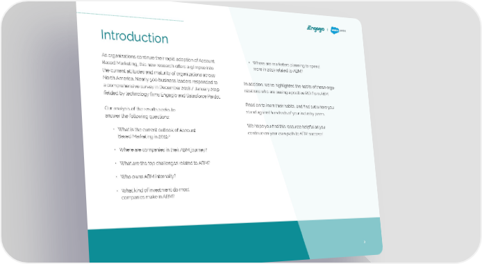 Introduction As organizations continue their rapid adoption of Account • Where are marketers planning to spend Based Marketing, this new research offers a glimpse into more in 2019 related to ABM? the current attitudes and maturity of organizations across North America. Nearly 500 business leaders responded to In addition, we’ve highlighted the habits of those orga- a comprehensive survey in December 2018 / January 2019 nizations who are seeing a positive ROI from ABM. fielded by technology firms Engagio and Salesforce Pardot. Read on to learn their habits, and find out where you Our analysis of the results seeks to stand against hundreds of your industry peers. answer the following questions: We hope you find this resource helpful as you • What is the current outlook of Account continue on your own path to ABM success! Based Marketing in 2019? • Where are companies in their ABM journey? • What are the top challenges related to ABM? • Who owns ABM internally? • What kind of investment do most companies make in ABM? 3