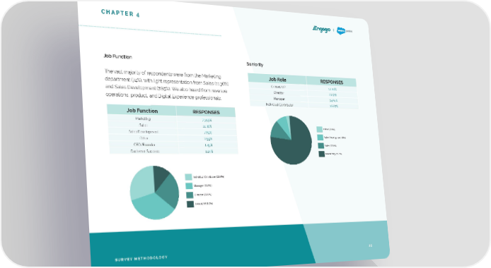 CHAPTER 4 Job Function Seniority The vast majority of respondents were from the Marketing S SPONSE ole RE ob R J department (74%), with light representation from Sales (11.36%) el/VP 12.99% v C-le or 23.51% ect and Sales Development (7.85%). We also heard from revenue Dir anager 34.64% operations, product, and Digital Experience professionals. M or 28.87% tribut Con Individual S SPONSE unction RE ob F J ting 73.55% e ark M Sales 11.36% Other (2.6%) .85% t 7 elopmen v Sales De 2.55% Sales Development (8%) Other ounder 1.45% Sales (11.6%) /F O CE ess 1.24% c Suc omer Cust Marketing (75.1%) Individual Cintributor (28.9%) Manager (34.6%) Director (23.5%) C-level/VP (12%) SURVEY METHODOLOGY 35