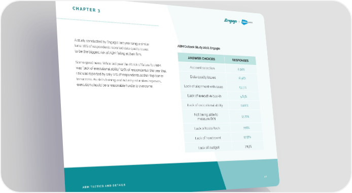 CHAPTER 3 A study conducted by Engagio last year sang a similar ABM Outlook Study 2018, Engagio tune: 18% of respondents reported data quality issues to be the biggest risk of ABM failing at their firm. ANSWER CHOICES RESPONSES Some good news: While last year the #1 risk of failure for ABM Account selection 8.98% was “lack of executional ability” (25% of respondents), this year that risk was reported by only 12% of respondents as their top barrier Data quality Issues 18.56% to success. As skills training and industry education improves, execution should be a reasonable hurdle to overcome. Lack of alignment with sales 13.77% Lack of executive buy-In 5.69% Lack of executional ability 11.68% Not being able to 13.77% measure ROI Lack of tools/tech 7.78% Lack of headcount 12.57% Lack of budget 7.19% ABM TACTICS AND DETAILS 27