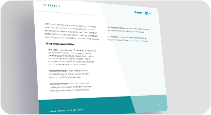 CHAPTER 2 ABM doesn’t require a wholesale change to your marketing Marketing Operations – tags accounts in CRM, and helps team. The truth is, you can get started with ABM right away with data appending to build out contact records. and increase your team’s involvement over time. If you’re just getting started, call upon your current marketing team to spin For more details on the roles and responsibilities of a up a pilot program to prove ABM success before fully investing. high-performance ABM team, download this worksheet. Roles and responsibilities: ABM Lead – often the head of marketing, this individual spearheads the initiative, develops playbooks and the technology infrastructure needed, tracks metrics and communications program success. They’re responsible for coordination with other departments and communication across the entire team. Product Marketing – helps to figure out the ICP (Ideal Customer Profile), ranking accounts based on best fit for your company. Marketing Manager – runs the program mix, crafting account-specific emails and messages, nurturing relationships and supporting Sales. ABM INVESTMENTS AND RESOURCES 12