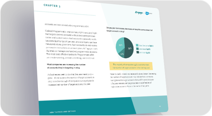 CHAPTER 3 accounts are best served with programmatic ABM. Do you plan to increase, decrease, or keep the same amount of target account in 2019? [Callout] Programmatic, one-to-many ABM is a style of ABM that targets desired accounts without dedicated personal- ization and customization. Each account is generally worth between $25K to $100K per year, and a company can have 53% Stay the same (35%) thousands at any given time. Such accounts do not receive 35% personalize interactions or account plans. At Engagio, each Decrease (12%) AE tends to manage one hundred programmatic accounts. Increase (53%) The most cost-effective tactics for Programmatic ABM 12% are email marketing, account advertising, and direct mail. Most companies are increasing the number The majority of companies (54%) plan in increase of accounts they’re targeting in 2019. the number of target accounts in the coming year As businesses seek to do what they are meant to do – Note: To clarify, more is not necessarily always better! Decreasing grow – it’s no surprise the number of target accounts in the number of target accounts may indicate that a company 2019 is on the rise. 54% of companies surveyed plan to has tightened its target account criteria. ABM works because increase their number of target accounts this year. it focuses relevant campaign touches on a defined set of high-value accounts. Focus is the name of the game. ABM TACTICS AND DETAILS 25
