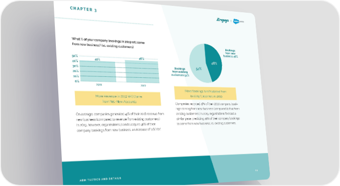CHAPTER 3 What % of your company bookings in 2019 will come from new business? (vs. existing customers) Bookings from new business 46% 50% 41% 46% 46% 40% 30% Bookings 54% 20% from existing customers 54% 10% 0% 2018 2019 More Bookings Are Predicted from More Revenue in 2019 Will Come Existing Customers in 2019 from Net-New Accounts Companies reported 47% of their 2018 company book- ings coming from new business (compared to that from On average, companies generated 41% of their 2018 revenue from existing customers.) In 2019, organizations forecast a new business (compared to revenue from existing customers.) similar pace, predicting 46% of their company bookings In 2019, however, organizations plan to acquire 46% of their to come from new business, vs. existing customers. company bookings from new business, an increase of 12% YoY. ABM TACTICS AND DETAILS 19