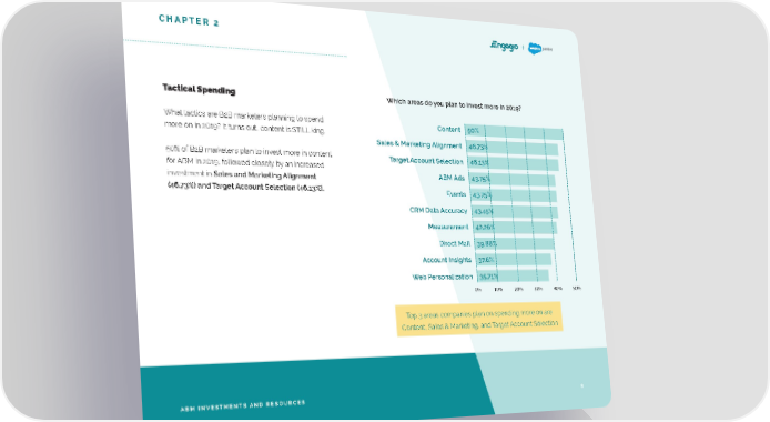 CHAPTER 2 Tactical Spending Which areas do you plan to invest more in 2019? What tactics are B2B marketers planning to spend Content 50% more on in 2019? It turns out, content is STILL king. Sales & Marketing Alignment 46.73% 50% of B2B marketers plan to invest more in content Target Account Selection 46.13% for ABM in 2019, followed closely by an increased investment in Sales and Marketing Alignment ABM Ads 43.75% (46.73%) and Target Account Selection (46.13%). Events 43.75% CRM Data Accuracy 43.45% Measurement 42.26% Direct Mail 39.88% Account Insights 37.8% Web Personalization 35.71% 0% 10% 20% 30% 40% 50% Top 3 areas companies plan on spending more on are Content, Sales & Marketing, and Target Account Selection ABM INVESTMENTS AND RESOURCES 8
