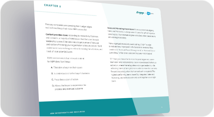 CHAPTER 2 The way companies are spending their budget aligns Sales and Marketing dream team: It’s no surprise that aligning well to three things that make ABM successful: Sales and Marketing is a large area of spend for 47% of organiza- tions in 2019. Your revenue engine works best when these teams Content provides clues: According to research by Edelman are working in lockstep. and LinkedIn, a majority of B2B buyers feel that your thought leadership is one of the best ways to get a sense of the type Many organizations actively avoid calling it “ABM” in order and caliber of thinking your organization is likely to deliver. Don’t to indicate how important it is for Sales to be involved. They underinvest in something so critical to earning the attention, and could call it “Account Based Management,” or “Account Based trust, of your potential buyer. Everything,” while others call it an “Account-First Initiative.” TOPO recommends that relevant content TIP: Your goal should be to move beyond alignment, where for ABM does four things: each team acts independently but in a coordinated fashion, to activation, where Marketing takes a stronger leadership role, A. Educates a buyer on their space activating Sales at the right time in order to move the business B. Is contextualized to the buyer’s business forward (especially when the human touch is required). The highest-performing teams have fully integrated Sales and C. Prescribes a plan of action Marketing, and both departments work together as a single team. D. Allows the buyer to experience the process and eventual outcome ABM INVESTMENTS AND RESOURCES 9