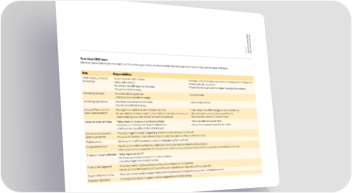 : s M s B e A c g c in u t s n o e d t m a e o t Vl r r p e a h P Im t Your ideal ABM team Whether you’re starting from scratch or filling in the gaps, these are the essential roles and responsibilities of a high-performance ABM team. Role Responsibilities ABM Lead (e.g. Head of • Spearheads the ABM initiative • Develops customized value propositions, messaging docs and playbooks Marketing) • Helps collect insight • Orchestrates all interactions • Runs the initial ABM alignment process. • Tracks the metrics and communicates the program’s successes • Recommends technology Marketing Manager • Runs the ABM program mix • Supports sales • Crafts account-specific messages Marketing Operations • Maintains account and contact data • Collects ABM metrics • Implements ABM technology Account Executive and • Manages the relationship with Executive Sponsor • Helps shapes the ABM strategy and each account plan sales team members • Responsible for driving the plan forward with the team and at the account • Aligns all conversations around account needs • Team meetings with internal staff and with the customer • Becomes the customer’s Trusted Advisor Sales Development Reps • Helps research the account and build contacts • Nurtures relationships over time • Reaches out to the account to build relationships • Supports the account executive as needed • Crafts account-specific emails and messages Solutions consultants / • Provides insight into what’s happening at the influencer and operational level delivery personnel • Ensures the ‘technical / operational’ programs and messages are relevant and resonating Field Marketer • Works with the ABM marketers to execute campaigns at the local level Corporate Marketer • Works with the ABM marketer to collaborate on corporate communications and campaigns • Understands what to customize for the customer and what programs can be included in the account’s communication strategy Product / Industry Marketer • Helps figure out the ICP • Ranks accounts based on best fit for your company • Provides insight into the industry view Product Management • Provides product roadmap insights to the account team and / or customer • Works with the ABM team to understand if custom solutions are required and what’s possible Support Representative • Reports and can escalate support items when they become consequential to customer satisfaction scores Executive Sponsors • Provides deal / account support to drive engagement and deal closings