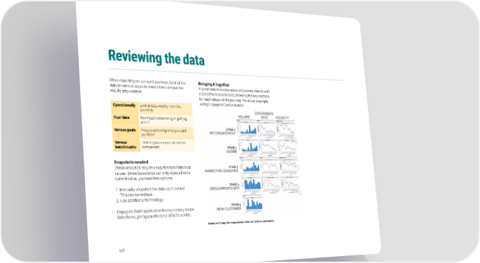 Reviewing the data When reporting on account journeys, look at the Bringing it together data in various ways so executives can put the A good way to review account journey data is with results into context. a Salesforce dashboard, showing the key metrics for each stage of the journey. Here’s an example Operationally Look at data weekly, monthly, using Engagio’s Dash solution. quarterly Over time See if you’re improving or getting worse Versus goals Are you achieving what you said you’d do? Versus How do you compare to similar benchmarks companies? Snapshots needed These analytics require a way to track historical values. Since Salesforce can only store a field’s current value, you have two options: 1. Manually snapshot the data each period. This can be tedious. 2. Use additional technology. Engagio’s Dash application tracks history inside Salesforce, giving you the best of both worlds. Example of stage-by-stage account funnel analytics dashboard. 127