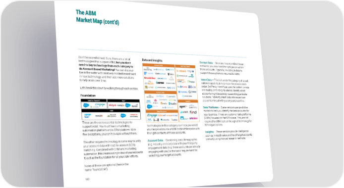 The ABM Market Map (cont’d) Don’t be overwhelmed. Sure, there are a lot of Data and insights Contact Data — Once you have identified those technologies that support ABM, but you don’t Account Data 3rd Party Intent accounts, you also need the right people within need to buy technology from each category to those accounts. Typically, investing in data to do Account Based Marketing! You can dip your support these actions is required for ABM. toe in the water with relatively modest investment in new technology, and then add more solutions Intent Data — This falls under the category of a cool, to help scale over time. optional capability to help make the process even better. 3rd Party Intent Data uses the content people Let’s break this down by walking through each section. are reading on third-party sites to identify which Contact Data accounts might be actively researching particular Foundation solutions. 1st Party Intent Data references how Lead-to-Account MAP Insights accounts interact with you on your properties. Data Platforms — Some vendors use predictive CRM Data Platforms models to help you identify the best accounts for your business. These are customer data platforms (CDPs) focused on the B2B space. They are not These are the core essential technologies to required for ABM, but can be a great technology for support ABM. You must have a marketing Technologies in this category can help you select B2B organizations. automation platform and a CRM platform. With your target accounts and fill in the whitespace with few exceptions, you can’t do ABM without them. the right contacts at those accounts. Insights — These vendors provide intelligence such as in-depth sales profiles of target accounts, The other required technology is some way to unify Account Data — Combining basic firmographic primarily using manual research methods. your account data with lead-to-account (L2A) (e.g. industry and size) data with your first party matching. Combined with CRM and marketing engagement data (e.g. these accounts are already automation, this creates a single view of your accounts engaging with you) is the basic requirement for to act as the foundation for all your ABM efforts. selecting your target accounts. None of these are optional (hence the name ‘foundation’). 160