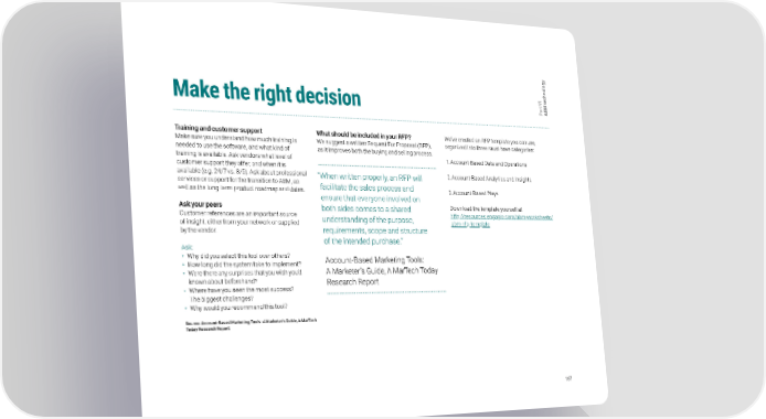 y g o l o chn I e t V t r M a B Make the right decision P A Training and customer support What should be included in your RFP? We’ve created an RFP template you can use, Make sure you understand how much training is We suggest a written Request For Proposal (RFP), organized into three must-have categories: needed to use the software, and what kind of as it improves both the buying and selling process. training is available. Ask vendors what level of 1. Account-Based Data and Operations customer support they offer, and when it is available (e.g. 24/7 vs. 8/5). Ask about professional “ When written properly, an RFP will 2. Account-Based Analytics and Insights services or support for the transition to ABM, as facilitate the sales process and well as the long-term product roadmap and dates. ensure that everyone involved on 3. Account-Based Plays Ask your peers both sides comes to a shared Download the template yourself at Customer references are an important source understanding of the purpose, http://resources.engagio.com/abm-worksheets/ of insight, either from your network or supplied requirements, scope and structure abm-rfp-template by the vendor. Ask: of the intended purchase.” • Why did you select this tool over others? Account-Based Marketing Tools: • How long did the system take to implement? A Marketer’s Guide, A MarTech Today • Were there any surprises that you wish you’d known about beforehand? Research Report • Where have you seen the most success? The biggest challenges? • Why would you recommend this tool? Source: Account-Based Marketing Tools: A Marketer’s Guide, A MarTech Today Research Report 167