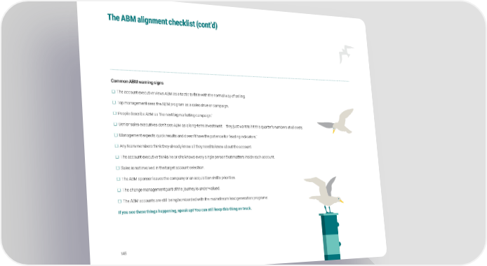 The ABM alignment checklist (cont’d) Common ABM warning signs £ The account executive views ABM as a tactic to fit in with the normal way of selling. £ Top management sees the ABM program as a sales drive or campaign. £ People describe ABM as ‘the next big marketing campaign.’ £ Senior sales executives don’t see ABM as a long-term investment — they just want to hit this quarter’s numbers at all costs. £ Management expects quick results and doesn’t have the patience for ‘leading indicators.’ £ Any team members think they already know all they need to know about the account. £ The account executive thinks he or she knows every single person that matters inside each account. £ Sales is not involved in the target account selection. £ The ABM sponsor leaves the company or an acquisition shifts priorities. £ The change management part of the journey is under-valued. £ The ABM accounts are still being bombarded with the mainstream lead generation programs. If you see these things happening, speak up! You can still keep this thing on track. 145