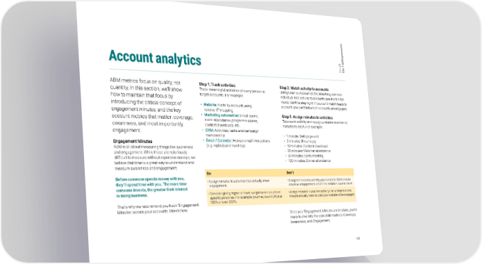 s e s s e c o r M p B III 7 A t e r a h Account analytics P T ABM metrics focus on quality, not Step 1: Track activities Step 2: Match activity to accounts quantity. In this section, we’ll show Track meaningful activities of every person at Using Lead-to-Account (L2A) Matching, connect how to maintain that focus by target accounts. For example: individual lead activity to accounts (see Part IV for introducing the critical concept of more). Get this step right! If you can’t match leads to • Website: Visits by account, using account, you can’t tell which accounts are engaged. engagement minutes, and the key reverse-IP mapping account metrics that matter: coverage, • Marketing automation: Email opens, Step 3: Assign minutes to activities awareness, and most importantly, event attendance, program success, Take each activity and assign a relative number of content downloads, etc. minutes to each. For example: engagement. • CRM: Activities, tasks and campaign membership • 1 minute: Web page visit Engagement Minutes • Email / Calendar: Human email interactions • 2 minutes: Email reply ABM is all about measuring things like awareness (e.g. replies) and meetings • 10 minutes: Content download and engagement. While these are notoriously • 30 minutes: Webinar attendance difficult to measure without expensive surveys, we • 30 minutes: Sales meeting believe that time is a great way to understand and • 120 minutes: Dinner attendance measure awareness and engagement. Do Don’t Before someone spends money with you, • Assign minutes to activities that actually show • Assign minutes to activity you complete. Sent emails they’ll spend time with you. The more time engagement. count as engagement only if the recipient opens them. someone invests, the greater their interest in doing business. • Consider giving higher or lower weight to minutes from • Assign minutes to passive activity like ad impressions. specific personas. For example, you may count CXOs at People actually need to visit your website to be engaged. That’s why we recommend you track ‘Engagement 150% or even 200%. Minutes’ across your accounts. Here’s how. Once your Engagement Minutes are in place, you’re ready to dive into the core ABM metrics: Coverage, Awareness, and Engagement. 110