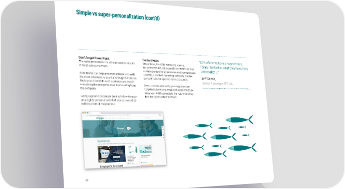 ( ) Simple vs super-personalization cont’d Don’t forget PowerPoint Content Hubs “ 80% of clients have a huge content The sales presentation is still a critical pivot point Freya News, the ABM marketing agency, library. We look at what they have, then in most sales processes. recommends industry-specific content hubs that personalize it.” contain content for all personas and buying stages. ABM teams can help arm each salesperson with Uberflip, a content marketing company, creates Jeff Sands, the most informed, relevant and insightful pitches content hubs for specific named accounts. Senior Associate, ITSMA that speak directly to each audience and match everything the prospects have been seeing from If you use this approach, you could then use the company. targeted advertising, email and social media to drive your ABM contacts to the hub, where they Using a generic corporate deck to follow-through find the right content for them. on a highly-personalized ABM process would be nothing short of malpractice. 69