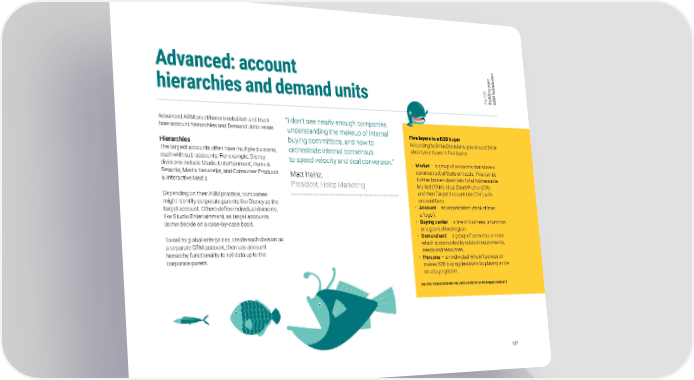 n o i Advanced: account r at ou d y n g ou V in f t Id r l M a ui B hierarchies and demand units P B A Advanced ABM practitioners establish and track “ I don’t see nearly enough companies how account hierarchies and Demand Units relate. understanding the makeup of internal Five layers to a B2B buyer Hierarchies buying committees, and how to According to SiriusDecisions, you should think The largest accounts often have multiple divisions, orchestrate internal consensus about your buyer in five layers: each with sub-accounts. For example, Disney to speed velocity and deal conversion.” • Market — a group of accounts that share a divisions include Studio Entertainment, Parks & common set of traits or needs. This can be Resorts, Media Networks, and Consumer Products Matt Heinz, further broken down into Total Addressable & Interactive Media. President, Heinz Marketing Market (TAM), Ideal Client Profile (ICP) Depending on their ABM practice, companies and then Target Account List (TAL) with might identify corporate parents like Disney as the account tiers. target account. Others define individual divisions, • Account — an organization (think of it as like Studio Entertainment, as target accounts. a ‘logo’). Some decide on a case-by-case basis. • Buying center — a line of business, a function, or a geo-defined region. To sell to global enterprises, create each division as • Demand unit — a group of personas or roles a separate CRM account, then use account which is connected by related requirements, hierarchy functionality to roll data up to the needs and resources. corporate parent. • Persona — an individual who influences or makes B2B buying decisions by playing a role on a buying team. Source: SiriusDecisons via John Common of Intelligent Demand 137