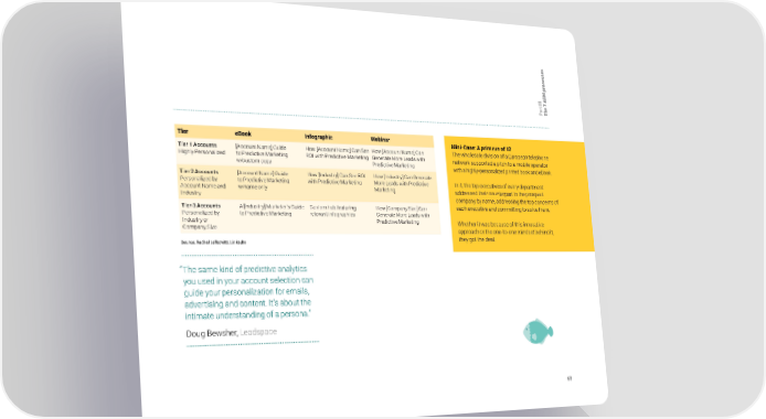 s e s s e c o r M p B III 7 A t e r a h P T Tier eBook Infographic Webinar Mini-Case: A print run of 12 Tier 1 Accounts [Account Name] Guide How [Account Name] Can See How [Account Name] Can The wholesale division of a European telephone Highly Personalized to Predictive Marketing ROI with Predictive Marketing Generate More Leads with network supported a pitch to a mobile operator w/custom copy Predictive Marketing with a highly-personalized printed book and eBook. Tier 2 Accounts [Account Name] Guide How [Industry] Can See ROI How [Industry] Can Generate Personalized by to Predictive Marketing with Predictive Marketing More Leads with Predictive In it, the top executives of every department Account Name and w/name only Marketing addressed their counterpart in the prospect Industry company by name, addressing the top concerns of Tier 3 Accounts A [Industry] Marketer’s Guide Custom hub featuring How [Company Size] Can each executive and committing to solve them. Personalized by to Predictive Marketing relevant infographics Generate More Leads with Industry or Predictive Marketing Whether it was because of this innovative Company Size approach or the one-to-one mindset behind it, Source: Rachel Lefkowitz, LinkedIn they got the deal. “ The same kind of predictive analytics you used in your account selection can guide your personalization for emails, advertising and content. It’s about the intimate understanding of a persona.” Doug Bewsher, Leadspace 68