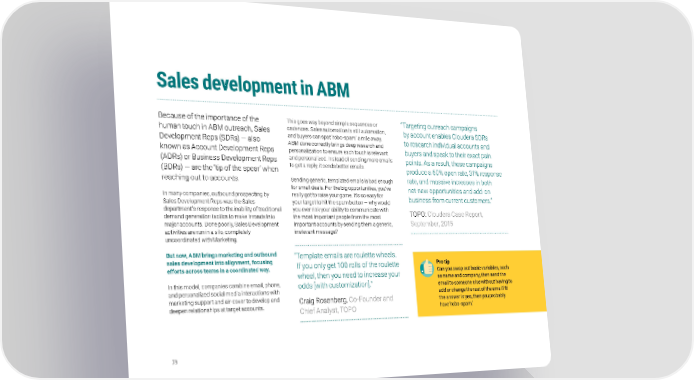 Sales development in ABM Because of the importance of the This goes way beyond simple sequences or “ Targeting outreach campaigns human touch in ABM outreach, Sales cadences. Sales automation is still automation, by account enables Cloudera SDRs Development Reps (SDRs) — also and buyers can spot ‘robo-spam’ a mile away. to research individual accounts and ABM done correctly brings deep research and known as Account Development Reps personalization to ensure each touch is relevant buyers and speak to their exact pain (ADRs) or Business Development Reps and personalized. Instead of sending more emails points. As a result, these campaigns (BDRs) — are the ‘tip of the spear’ when to get a reply, it sends better emails. produce a 60% open rate, 31% response reaching out to accounts. Sending generic, templated emails is bad enough rate, and massive increases in both for small deals. For the big opportunities, you’ve net-new opportunities and add-on In many companies, outbound prospecting by really got to raise your game. It’s so easy for business from current customers.” Sales Development Reps was the Sales your target to hit the spam button — why would department’s response to the inability of traditional you ever risk your ability to communicate with TOPO: Cloudera Case Report, demand generation tactics to make inroads into the most important people from the most September, 2015 major accounts. Done poorly, Sales Development important accounts by sending them a generic, activities are run in a silo, completely irrelevant message? uncoordinated with Marketing. But now, ABM brings marketing and outbound “ Template emails are roulette wheels. sales development into alignment, focusing If you only get 100 rolls of the roulette Pro tip efforts across teams in a coordinated way. wheel, then you need to increase your Can you swap out basic variables, such In this model, companies combine email, phone, odds [with customization].” as name and company, then send the and personalized social media interactions with email to someone else without having to marketing support and air-cover to develop and add or change the rest of the email? If deepen relationships at target accounts. Craig Rosenberg, Co-Founder and the answer is yes, then you probably Chief Analyst, TOPO have ‘robo-spam.’ 79