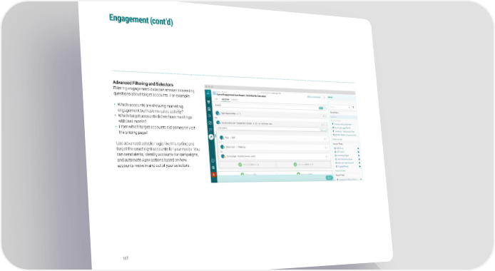 Engagement (cont’d) Advanced Filtering and Selectors Filtering engagement data can answer interesting questions about target accounts. For example: • Which accounts are showing marketing engagement but have no sales activity? • Which target accounts did we have meetings with last month? • From which target accounts did someone visit the pricing page? Use advanced selector logic like this to find and target the exact right accounts for your needs. You can send alerts, identify accounts for campaigns, and automate ABM actions based on how accounts move in and out of your selectors. 117