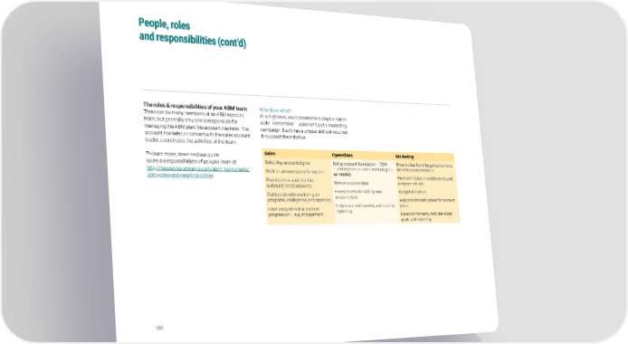 People, roles and responsibilities (cont’d) The roles & responsibilities of your ABM team Who does what? There can be many members of an ABM account At a high level, each department plays a role in team, but generally only one is responsible for ABM. Remember — ABM isn’t just a marketing managing the ABM plan: the account marketer. The campaign. Each has a unique skill set required account marketer, in concert with the sales account to support the initiative. leader, coordinates the activities of the team. To learn more, download our guide Sales Operations Marketing Roles & Responsibilities of an ABM Team at Select key accounts by tier. Set up account foundation — CRM Ensure clear list of target accounts is http://resources.engagio.com/abm-worksheets/ Work on account plans for top tier. — and implement other technologies identified and prioritized. abm-roles-and-responsibilities as needed. Work with Sales on entitlements and Prioritize time and effort for Review account data. program roll-out. outbound tiered accounts. Collaborate with marketing on Have process for adding new Budget allocation. programs, intelligence, and reporting. account data. Help provide intelligence for account Have a way to look at account Help teams with weekly and monthly plans. progression — e.g. engagement. reporting. Have plan for early, mid, late stage goals and reporting. 153