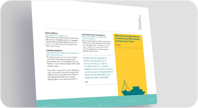 g in t e k o r t a c i m r c t i n r t ce n - ce ad - e t l n t I m ou r c a ro c P F a Sales excellence Account penetration and expansion “ ABM delivers the highest Return on ABM enables the challenger sale ABM guides intelligent account expansion Investment of any B2B marketing Sales wants to have challenger sales conversations at existing customers strategy or tactic. Period.” that ‘teach for differentiation and tailor for resonance’. Many companies get more revenue (and revenue ABM provides the ideal strategy and framework growth) from current customers than from new ITSMA for this — and delivers the account insights that ones. With large deals, it’s all about ‘land and help make it happen. expand.’ ABM delivers smart, personalized account orchestration for a greater share of Customer experience wallet and higher margin. ABM delivers the consistently relevant experience that customers demand The highly personalized nature of the discipline “Ri sing customer expectations means that all interactions are synchronized are the most disruptive trend across channels and highly targeted to maximize relevance. You look like one company with a single, in business today. Companies compelling story. that differentiate their customer In fact, 58% of respondents say that ABM plays a relationships on the basis of account- major role in making their entire company more specific insights and responsiveness customer centric, according to the ITSMA and raise customer expectations and ABM Leadership Alliance Account Based create competitive advantage.” Marketing Benchmarking Survey (July 2017). IDC 14