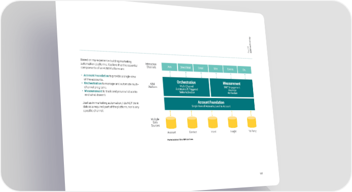 y g o l o chn I e t V t r M a B P A Based on my experience building marketing Interaction automation platforms, I believe that the essential Channels Ads Direct Mail Email Web Events Etc. components of an ABM Platform are: • Account Foundation to provide a single view of the accounts. Orchestration Measurement • Orchestration to manage and automate multi- ABM Multi-Channel 360° Engagement channel programs. Platform Automated & Triggered Journeys • Measurement to track and prove what works Sales Activation Attribution and what doesn’t. Just as in marketing automation, I do NOT think Account Foundation data is a required part of the platform, nor is any Single View of Accounts, Lead-to-Account specific channel. Multiple Data Sources Account Contact Intent Insight 1st Party Marketecture of the ABM platform. 165
