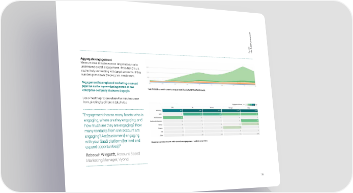 s e s s e c o r M p B III 7 A t e r a h P T Aggregate engagement Measure total minutes across target accounts to understand overall engagement. If this trend is up, you’re likely connecting with target accounts. If this number goes down, the program needs work. Engagement has replaced marketing-sourced pipeline as the top marketing metric at one Target accounts with increasing engagement illuminate ABM’s effectiveness. enterprise company that uses Engagio. Use a ‘heatmap’ to see where the minutes come from, pivoting by different data fields. “Engagement has so many facets: who is engaging, where are they engaging, and how much are they are engaging? How many contacts from one account are engaging? Are [customers] engaging with your SaaS platform (for land and Heatmaps show accounts with executive engagement — and those without. expand opportunities)?” Rebecah Wiegardt, Account Based Marketing Manager, Vyond 116