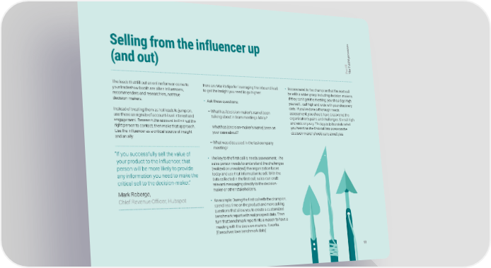 s e s s e c o Selling from the influencer up r M p B III 7 A t e r (and out) a h P T The leads that fill out an online form or come to Here are Mark’s tips for leveraging the inbound lead • Recommend to the champion that the next call your tradeshow booth are often influencers, to get the insight you need to go higher: be with a wider group including decision-makers. recommenders and researchers, not true If they can’t get the meeting, you should go high decision-makers. • Ask these questions: yourself… call high and wide with your discovery data. If you’ve done a thorough needs Instead of treating them as hot leads to jump on, — What has [decision-maker’s name] been assessment, you should have discovered the use these as signals of account-level interest and talking about in team meetings lately? organization’s pains and challenges. So call high engagement. Research the account to find out the and wide anyway. The key is to translate what right person to contact, then make that approach. — What has [decision-maker’s name] been on you heard on the first call into a reason the Use the influencer as a critical source of insight your case about? decision-maker should care about you. and an ally. — What was discussed in the last company meeting? “ If you successfully sell the value of • The key to the first call is needs assessment. The your product to the influencer, that sales person needs to understand the challenges person will be more likely to provide (realized or unrealized) the organization faces any information you need to make the today and use that information to sell. With the critical sell to the decision-maker.” data collected in the first call, sales can craft relevant messaging directly to the decision- Mark Roberge, maker or other stakeholders. Chief Revenue Officer, Hubspot • An example: During the first call with the champion, spend less time on the product and more asking questions that allow you to create a customized benchmark report with real prospect data. Then turn that benchmark report into a reason to have a meeting with the decision-makers. It works. (Executives love benchmark data) 98