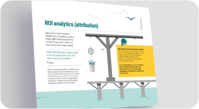 s e s s e c o r M p B III 7 A te r ah ROI analytics (attribution) PT Measuring impact has been Marketing’s holy grail since John Wanamaker famously admitted he didn’t know which half of his advertising dollars was wasted. ROI’s purpose: improve (not prove) marketing ROI is most valuable when evaluating marketing “ While B2B CMOs say measuring ROI investments, not justifying Marketing. Given the is their top priority, less than 20% reality of budget limitations, CMOs need to report having the capability.” make trade-offs about where to focus resources — and ROI provides a framework Forbes to improve these decisions. Don’t use ROI analytics to ‘prove’ Marketing works, use them to ‘improve’ decisions With account-based multi-touch attribution, it’s about where to focus resources. Energy finally possible for B2B marketers to ascertain spent justifying Marketing only wastes time which programs work and which don’t, and how and resources. each affects revenue and profits. Armed with knowledge about individual and aggregated program ROI, marketers can use the insights to allocate budget for maximum impact. 128