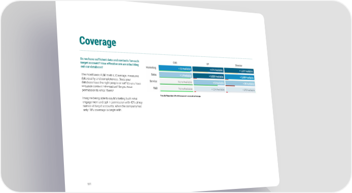 Coverage Do we have sufficient data and contacts for each target account? How effective are we at building out our database? The most basic ABM metric, Coverage, measures data quality and completeness. Does your database have the right people or not? Do you have accurate contact information? Do you have permission to email them? People Maps identify white space in account coverage. Imagine being able to say Marketing built initial engagement and opt-in permission with 42% of key names at target accounts, when the company had only 18% coverage to begin with. 111