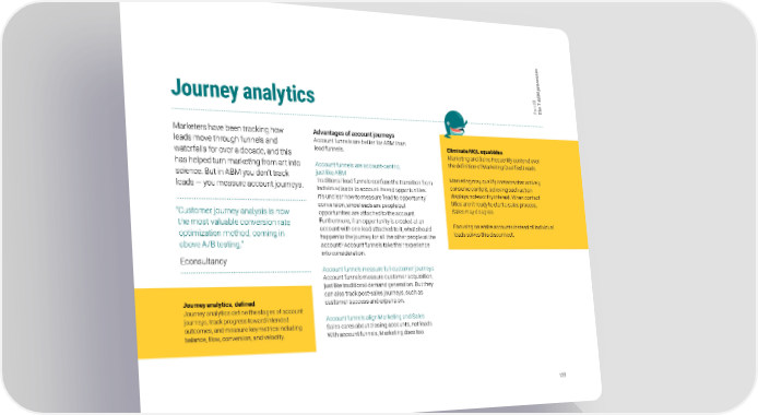 s e s s e c o r M p B III 7 A t e r a h Journey analytics P T Marketers have been tracking how Advantages of account journeys leads move through funnels and Account funnels are better for ABM than Eliminate MQL squabbles waterfalls for over a decade, and this lead funnels. Marketing and Sales frequently contend over has helped turn marketing from art into Account funnels are account-centric, the definition of Marketing Qualified Leads. science. But in ABM you don’t track just like ABM Marketing may qualify contacts that actively leads — you measure account journeys. Traditional lead funnels confuse the transition from consume content, believing such action individual leads to account-based opportunities. displays noteworthy interest. When contact It’s unclear how to measure ‘lead to opportunity’ titles aren’t ready to start a sales process, “C ustomer journey analysis is now conversion, since leads are people but Sales may disagree. opportunities are attached to the account. the most valuable conversion rate Furthermore, if an opportunity is created at an Focusing on entire accounts instead of individual optimization method, coming in account with one lead attached to it, what should leads solves this disconnect. above A/B testing.” happen to the journey for all the other people at the account? Account funnels take their experience Econsultancy into consideration. Account funnels measure full customer journeys Account funnels measure customer acquisition, just like traditional demand generation. But they can also track post-sales journeys, such as Journey analytics, defined customer success and expansion. Journey analytics define the stages of account journeys, track progress toward intended Account funnels align Marketing and Sales outcomes, and measure key metrics including Sales cares about closing accounts, not leads. balance, flow, conversion, and velocity. With account funnels, Marketing does too. 120