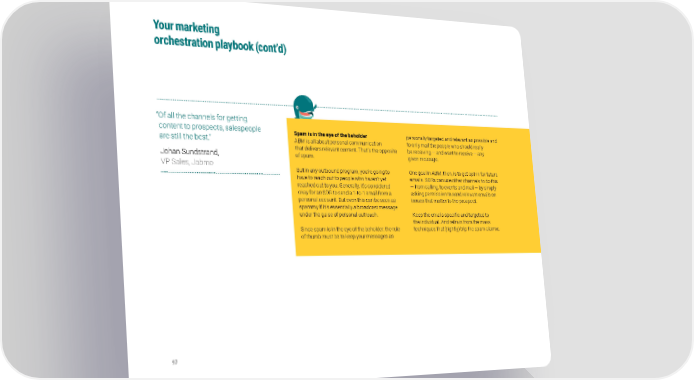 Your marketing orchestration playbook (cont’d) “ Of all the channels for getting content to prospects, salespeople Spam is in the eye of the beholder personally targeted and relevant as possible and are still the best.” ABM is all about personal communication to only mail the people who should really that delivers relevant content. That’s the opposite be receiving — and want to receive — any Johan Sundstrand, of spam. given message. VP Sales, Jabmo But in any outbound program, you’re going to One goal in ABM, then, is to get opt-in for future have to reach out to people who haven’t yet emails. SDRs can use other channels to do this reached out to you. Generally, it’s considered — from calling, to events and mail — by simply okay for an SDR to send a 1-to-1 email from a asking permission to send relevant emails on personal account. But even this can be seen as issues that matter to the prospect. spammy if it’s essentially a broadcast message under the guise of personal outreach. Keep the emails specific and targeted to the individual. And refrain from the mass Since spam is in the eye of the beholder, the rule techniques that (rightly) trip the spam alarms. of thumb must be to keep your messages as 97