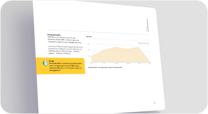 s e s s e c o r M p B III 7 A t e r a h P T Using web traffic ABM efforts are likely serving to improve awareness if web traffic increases, especially compared to traffic from non-targeted accounts. Use reverse IP lookup technology to identify which accounts are visiting your website. While you can build this yourself, there are tools — including Engagio — that can do it for you. Pro tip While web traffic is interesting, don’t be fooled into thinking you can measure ABM results with web traffic alone. It’s just one component Increasing web traffic from target accounts is a sign of increasing awareness. of engagement. 114