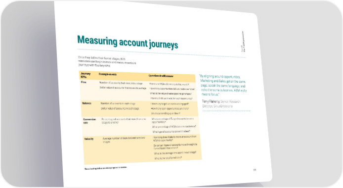 s e s s e c o r M p B III 7 A t e r a h Measuring account journeys P T Once they define their funnel stages, B2B marketers can begin to track and measure account journeys with four key KPIs: Journey Example metric Questions it will answer “ By aligning around opportunities, KPIs Marketing and Sales get on the same Flow Number of accounts that move into a stage How many MQAs did we create this month? page, speak the same language, and Dollar value of accounts that move into a stage How many opportunities did we create over time? echo the same outcomes. ABM really What is the value of sales pipeline generated? means focus.” How much do we invest for each opportunity? Terry Flaherty, Senior Research Balance Number of accounts in each stage How many target accounts are engaged? Director, SiriusDecisions Dollar value of accounts in each stage How many open opportunities are there? Are these trending up or down? Conversion Percentage of accounts that move from one What percentage of Target Accounts become rate stage to another opportunities? What percentage of MQAs become customers? What type of accounts convert the best? Velocity Average number of days between any two How long does it take to move an account from stages MQA to opportunity? Do certain types of accounts move through the funnel faster than others? What is the average time spent in each stage? What is the total funnel time? These leading indicators show progress to revenue. 126