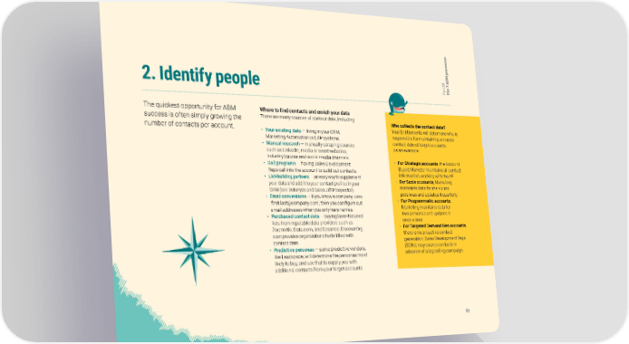 s e s s e c o r M p B III 7 A t e r a h 2. Identify people P T The quickest opportunity for ABM Where to find contacts and enrich your data success is often simply growing the There are many sources of contact data, including: Who collects the contact data? number of contacts per account. • Your existing data — living in your CRM, Your Entitlements will determine who is Marketing Automation or ERP systems. responsible for maintaining accurate • Manual research — manually scraping sources contact data at target accounts. such as LinkedIn, media or event websites, As an example: industry forums and social media channels. • For Strategic accounts, the Account • Call programs — having Sales Development Based Marketer maintains all contact Reps call into the account to build out contacts. information, working with the AE. • List-building partners — an easy way to supplement • For Scale accounts, Marketing your data and add it to your contact profiles in your maintains data for the six top CRM (see Datanyze and SalesLoft Prospector). personas and updates it quarterly. • Email conventions — if you know a company uses • For Programmatic accounts, ‘[email protected]’, then you can figure out Marketing maintains data for email addresses when you only have names. two personas and updates it • Purchased contact data — buying laser-focused once a year. lists from reputable data providers such as • For Targeted Demand Gen accounts, ZoomInfo, Data.com, and Oceanos; DiscoverOrg there is no proactive contact even provides organization charts filled with generation; Sales Development Reps contact data. (SDRs) may source contacts in • Predictive personas — some predictive vendors, advance of a big calling campaign. like Leadspace, will determine the personas most likely to buy, and use that to supply you with additional contacts from your target accounts. 50