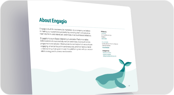 About Engagio Engagio is built for marketers, by marketers. As a company, we believe Written by: in making our customers successful by providing them with solutions Jon Miller that help them understand, act, and measure account-based initiatives. Co-Founder and CEO Engagio Engagio’s Account Based Marketing Automation Platform enables @jonmiller B2B marketers to successfully execute and measure account-centric Doug Kessler programs in one solution. Revenue teams can track which accounts are Co-Founder and Creative Director engaging, where to focus time and resources, and then have a shared Velocity Partners @dougkessler understanding of program impact. Our platform grows with you as your Designed by: ABM strategy and business needs evolve. Velocity Partners @velocitytweets [email protected] 172