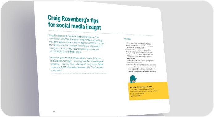 Craig Rosenberg’s tips for social media insight “S ocial intelligence tends to be the best intelligence. The Quick tips: information someone shares on social media is something • If the prospect is on Twitter, follow them and they care about and can make for easy connections. You can retweet or quote their tweets with a comment. truly personalize the message with this kind of information. Everyone likes to be retweeted. ‘Congratulations on your recent product launch’ or just • Consider putting a personal message in the something in their LinkedIn profile.” retweet. If you have a great piece of content that ties with their content, forward it to them. • If the prospect is on Facebook, you can like a “A BM also gives social teams an ideal mission. Go to your status update. social media manager — who may have been tweeting out • Use LinkedIn InMail as a touch in prospecting — generally — and say, ‘Give us Microsoft insights and deliver it often out-performs email. • Keep your own social profiles strong — and make content to 2,800 Microsoft marketers daily.’ That’s a great sure each SDR and sales rep has a complete and social brief.” up-to-date profile. Heat maps show that the headline, photo and summary are the most viewed. Any insight is better than no insight One company, Network Hardware Resale, lifted email conversion rates simply by mentioning the local weather in the opening sentence! 59