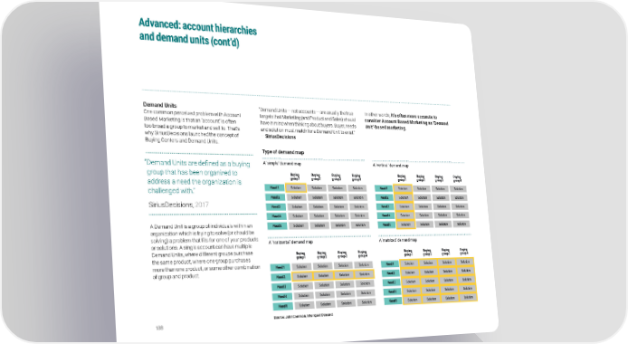 Advanced: account hierarchies and demand units (cont’d) Demand Units “ Demand Units — not accounts — are usually the true In other words, it’s often more accurate to One common perceived problem with Account targets that Marketing (and Product and Sales) should consider Account Based Marketing as ‘Demand Based Marketing is that an ‘account’ is often have in mind when thinking about buyers. Buyer, needs Unit’-based marketing. too broad a group to market and sell to. That’s and solution must match for a Demand Unit to exist.” why SiriusDecisions launched the concept of — SiriusDecisions Buying Centers and Demand Units. Type of demand maps Type of demand map “ Demand Units are defined as a buying A ‘simple’ demand map A ‘vertical’ demand map group that has been organized to Buying Buying Buying Buying Buying Buying Buying Buying address a need the organization is group 1 group 2 group 3 group 4 group 1 group 2 group 3 group 4 challenged with.” Need 1 Solution Solution Solution Solution Need 1 Solution Solution Solution Solution Need 2 Solution Solution Solution Solution Need 2 Solution Solution Solution Solution SiriusDecisions, 2017 Need 3 Solution Solution Solution Solution Need 3 Solution Solution Solution Solution Need 4 Solution Solution Solution Solution Need 4 Solution Solution Solution Solution A Demand Unit is a group of individuals within an Need 5 Solution Solution Solution Solution Need 5 Solution Solution Solution Solution organization which is trying to solve (or should be solving) a problem that fits for one of your products A ‘horizontal’ demand map A ‘matrixed’ demand map or solutions. A single account can have multiple Demand Units, where different groups purchase Buying Buying Buying Buying Buying Buying Buying Buying the same product, where one group purchases group 1 group 2 group 3 group 4 group 1 group 2 group 3 group 4 more than one product, or some other combination Need 1 Solution Solution Solution Solution Need 1 Solution Solution Solution Solution of group and product. Need 2 Solution Solution Solution Solution Need 2 Solution Solution Solution Solution Need 3 Solution Solution Solution Solution Need 3 Solution Solution Solution Solution Need 4 Solution Solution Solution Solution Need 4 Solution Solution Solution Solution Need 5 Solution Solution Solution Solution Need 5 Solution Solution Solution Solution 138 Source: John Common, Intelligent Demand