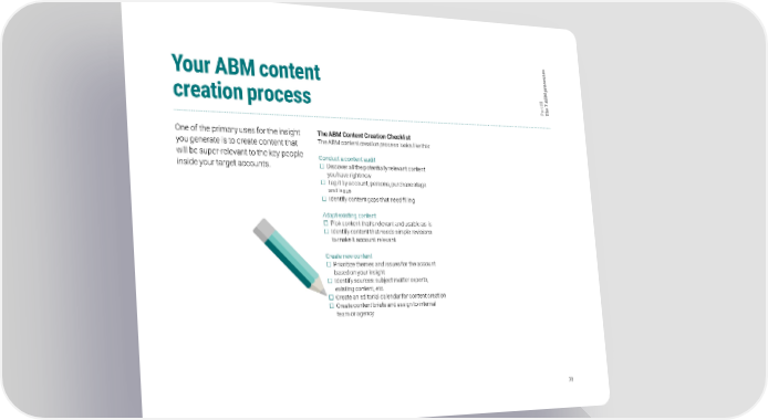 s e s s e c o Your ABM content r M p B III 7 A t e r a h creation process P T One of the primary uses for the insight The ABM Content Creation Checklist you generate is to create content that The ABM content creation process looks like this: will be super-relevant to the key people Conduct a content audit inside your target accounts. £ Discover all the potentially relevant content you have right now £ Tag it by account, persona, purchase stage and issue £ Identify content gaps that need filling Adapt existing content £ Pick content that’s relevant and usable as-is £ Identify content that needs simple revisions to make it account-relevant Create new content £ Prioritize themes and issues for the account based on your insight £ Identify sources: subject matter experts, existing content, etc. Create an editorial calendar for content creation £ Create content briefs and assign to internal team or agency 70