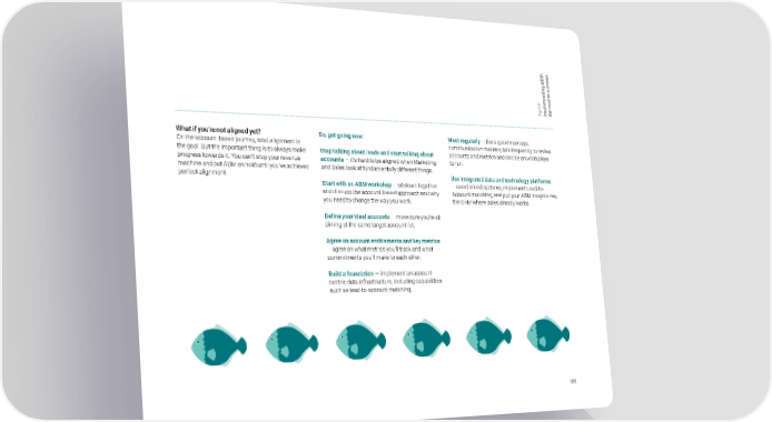 : s M s B e A c g c in u t s n o e d t m a e o t Vl r r p e a h P Im t What if you’re not aligned yet? So, get going now: Meet regularly — like a good marriage, On the account-based journey, total alignment is communication matters; talk frequently to review the goal. But the important thing is to always make Stop talking about leads and start talking about accounts and metrics and decide on what plays progress towards it. You can’t stop your revenue accounts — it’s hard to be aligned when Marketing to run. machine and put ABM on hold until you’ve achieved and Sales look at fundamentally different things. perfect alignment. Use integrated data and technology platforms Start with an ABM workshop — sit down together — avoid siloed systems, implement Lead-to- and discuss the account-based approach and why Account matching, and put your ABM insights into you need to change the way you work. the CRM where Sales already works. Define your ideal accounts — make sure you’re all aiming at the same target account list. Agree on account entitlements and key metrics — agree on what metrics you’ll track and what commitments you’ll make to each other. Build a foundation — implement an account- centric data infrastructure, including capabilities such as lead-to-account matching. 150
