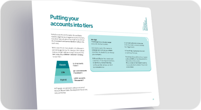t f o elopmen Putting your t Based v oun c art 7c accounts into tiers P The WHO ASales De Not all accounts are the same. So you’ll also need to organize your target accounts into tiers, based on how valuable they might be (and how Aim high much research and personalization will go into The Bridge Group clusters target C: Compelling Events: Companies each one). accounts into four buckets: in which a need is created suddenly by a trigger event. We’ll cover this in more depth in the Research A: A-List Accounts: The named or section (page 53), but for now, just think about strategic accounts on your dream D: Dead Ends: Companies that can’t how you might split your target accounts into client list. The deals that can change or won’t buy from you. tiers, applying a different treatment strategy your company. to each tier: The Bridge Group advises focusing your B: Bread & Butter: Your sweet spot outbound SDRs on the A list and let the customers. There may be too many inbound team focus on B. 5–50 accounts to identify by name (there may (To us, a case can be made for adding Classic ("tens") be thousands), but you can do it C accounts into the SD list if they meet by characteristics. core criteria.) Lite 50–1,000 accounts ("hundreds") Hybrid 1,000+ accounts ("thousands") At Engagio, we advocate using a version of Account Based Sales Development for all tiers, not just the top. 36