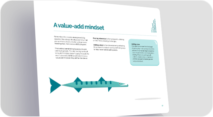 eam t t wing and elopmen art 11ov A value-add mindset P Grmanaging a sales de Remember, this is sales development. Big Proving relevance to their prospects, advising opportunities always develop over time. If all on their most pressing challenges. you want is to attack a market and generate Adding value meetings fast, that’s not an ABSD program. Adding value to the conversation by reflecting One team we’ve seen has the target the prospect’s real pain points and finding ways of getting high-value prospects on the This is about penetrating big accounts and to help – even before selling starts. phone with a market insight expert for landing big deals. The ‘pile ‘em high and sell a 30-minute trends-and-implications ‘em quick’ mindset doesn’t apply. Instead, the briefing. There’s no selling at all – most successful ABSD practitioners have a until the relationship is established ‘value add’ mindset: they define the role as: and the prospect’s challenges are well understood. 97