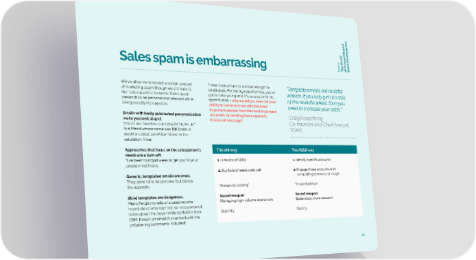t Based t elopmen T v oun c c art 8 A f Sales spam is embarrassing P The WHAoSales De We’ve all come to accept a certain amount These kinds of tactics are bad enough for "Template emails are roulette of marketing spam (though we still hate it). small deals. For the big opportunities, you’ve wheels. If you only get 100 rolls But ‘sales spam’ is far worse. Sales spam got to raise your game. It’s so easy to hit the pretends to be personal and relevant while spam button – why would you ever risk your of the roulette wheel, then you being exactly the opposite. ability to communicate with the most need to increase your odds.” important people from the most important Emails with badly automated personalization accounts by sending them a generic, Craig Rosenberg make you look stupid. irrelevant message? Co-founder and Chief Analyst, One of our favorites started with “Hi, Mr. Jr!” to a friend whose name was Bill Smith Jr. TOPO Another called Jon Miller ‘Steve’ in the salutation. Nice. Approaches that focus on the salesperson’s The old way The ABSD way needs are a turn-off. “I’ve been trying all week to get you” is your 1. Hire lots of SDRs 1. Identify specific accounts problem not theirs. 2. Buy lists of leads cold call 2. Engage those accounts with Generic, templated emails are crass. compelling commercial insight They pretend to be personal but betray the opposite. “Always be closing” “Trusted advisor" Blind templates are dangerous. Secret weapon: Secret weapon: Maria Pergolino tells of a sales rep she Managing high-volume operations Better data, more research heard about who kept not-so-nice personal notes about the buyer in Notes field in their Quantity Quality CRM. Result: an email that arrived with the unflattering comments included! 49