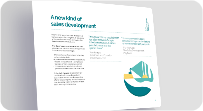 sales t A new kind of f kind o w elopmen art 1 ne v sales development P A de In some form or another, sales development “Thr oughout history, specialization “F or many companies, sales has been around for a long time. In fact, some has been the breakthrough development reps are the first line of the world’s most famous companies (like Salesforce.com) were built on it. to better techniques. It allows of human contact with prospects.” people to excel at a few The idea of breaking out a specialized sales specific tasks.” Trish Bertuzzi development role from the Sales department The Sales Development, is based on unassailable logic: Ken Krogue Playbook • It focuses Account Executives on what they President and Founder, do best: closing deals InsideSales.com • It professionalizes the process of opportunity creation and qualification – giving the job to people who are especially suited to it • It boosts sales productivity, accelerates growth and lowers costs at the same time At the start, the sales development role combined both inbound opportunity qualification and outbound prospecting efforts. It was a big step and the companies that pioneered it grew at impressive rates. But it was only the beginning. 5