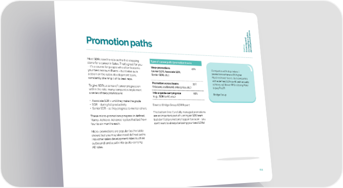 eam t t wing and elopmen art 11ov Promotion paths P Grmanaging a sales de Most SDRs see the role as the first stepping Type of career path/promotion tracks stone for a career in Sales. That’s great for you – it’s a source for people who often become Step-promotions 46% Companies with step (micro-) your best Account Execs – but it also puts (Junior SDR, Associate SDR, promotions achieve a 6% higher a strain on the sales development team, Senior SDR, etc.) Pipeline Power Score. But companies constantly draining it of its best reps. with a defined SDR-to-AE path actually Promotion across teams 35% achieve a 9% lower PPS (robbing Peter To give SDRs a sense of career progression (Inbound, outbound, enterprise, etc.) to pay Paul?) within the role, many companies implement a series of step promotions: Into a quota-carrying role 58% Bridge Group (e.g. , SDR to AE, etc.) • Associate SDR – until they make the grade • SDR – during full productivity Source: Bridge Group SDR Report • Senior SDR – as they progress to mentor others The bottom line: Carefully managed promotions These micro-promotions progress in defined, are an important part of running an SDR team. ‘Ramp-Achieve-Advance’ cycles that last from But don’t let promotions happen too soon – you four to six months each. don’t want to always be losing your best SDRs! Micro-promotions are popular (as the table shows) but you may also need defined paths into other sales development roles (such as outbound) and a path into quota-carrying AE roles. 114