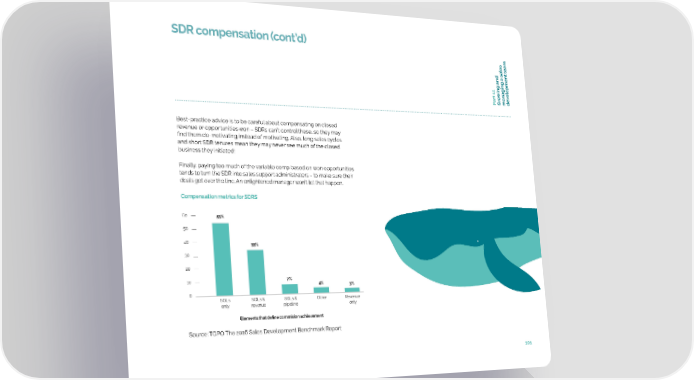 SDR compensation (cont’d) eam t t wing and elopmen art 11ov P Grmanaging a sales de Best-practice advice is to be careful about compensating on closed revenue or opportunities won – SDRs can’t control these, so they may find them de-motivating instead of motivating. Also, long sales cycles and short SDR tenures mean they may never see much of the closed business they initiated! Finally, paying too much of the variable comp based on won opportunities tends to turn the SDR into sales support administrators – to make sure their deals get over the line. An enlightened manager won’t let that happen. Compensation metrics for SDRS 60 53% 50 40 33% 30 20 10 7% 4% 3% 0 SQLs SQLs & SQLs & Other Revenue only revenue pipeline only Elements that define commision achievement Source: TOPO The 2016 Sales Development Benchmark Report 101
