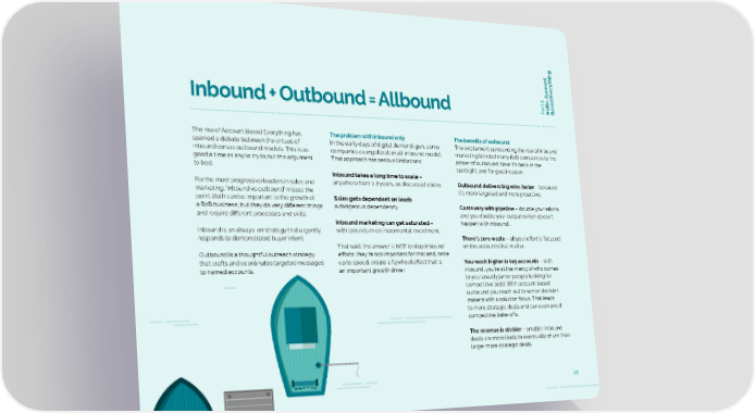 t ounerything c v c art 5ello, A Inbound + Outbound = Allbound P H Based E The rise of Account Based Everything has The problem with inbound only The benefits of outbound sparked a debate between the virtues of In the early days of digital demand-gen, some The excitement surrounding the rise of inbound inbound versus outbound models. This is as companies evangelized an all-inbound model. marketing blinded many B2B companies to the good a time as any to try to put this argument That approach has serious limitations: power of outbound. Now it’s back in the to bed. spotlight, and for good reason: Inbound takes a long time to scale – For the most progressive leaders in sales and anywhere from 1-2 years, as discussed above. Outbound delivers big wins faster – because marketing, ‘inbound vs outbound’ misses the it’s more targeted and more proactive. point. Both can be important to the growth of Sales gets dependent on leads – a B2B business, but they do very different things a dangerous dependency. Costs vary with pipeline – double your efforts and require different processes and skills. and you double your output (which doesn’t Inbound marketing can get saturated – happen with inbound). Inbound is an always-on strategy that urgently with less return on incremental investment. responds to demonstrated buyer intent. There’s zero waste – all your effort is focused That said, the answer is NOT to stop inbound on the accounts that matter. Outbound is a thoughtful outreach strategy efforts: they’re too important for that and, once that crafts and coordinates targeted messages up to speed, create a flywheel effect that is You reach higher in key accounts – with to named accounts. an important growth driver. inbound, you’re at the mercy of who comes to you (usually junior people looking for competitive bids). With account based outbound you reach out to senior decision makers with a solution focus. That leads to more strategic deals and can even avoid competitive bake-offs. The revenue is stickier – smaller, inbound deals are more likely to eventually churn than larger more strategic deals. 28