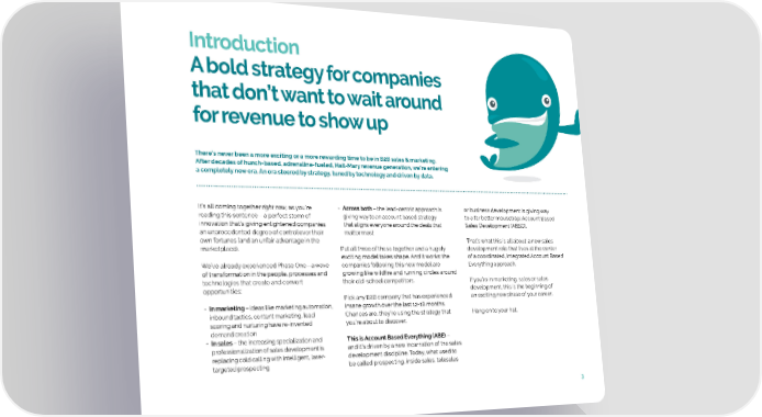Introduction A bold strategy for companies that don’t want to wait around for revenue to show up There’s never been a more exciting or a more rewarding time to be in B2B sales & marketing. After decades of hunch-based, adrenaline-fueled, Hail-Mary revenue generation, we’re entering a completely new era. An era steered by strategy, tuned by technology and driven by data. It’s all coming together right now, as you’re • Across both – the lead-centric approach is or business development is giving way reading this sentence – a perfect storm of giving way to an account based strategy to a far better mousetrap: Account Based innovation that’s giving enlightened companies that aligns everyone around the deals that Sales Development (ABSD). an unprecedented degree of control over their matter most own fortunes (and an unfair advantage in the That’s what this is all about: a new sales marketplace). Put all three of these together and a hugely development role that lives at the center exciting model takes shape. And it works: the of a coordinated, integrated Account Based We’ve already experienced Phase One—a wave companies following this new model are Everything approach. of transformation in the people, processes and growing like wildfire and running circles around technologies that create and convert their old-school competitors. If you’re in marketing, sales or sales opportunities: development, this is the beginning of Pick any B2B company that has experienced an exciting new phase of your career. • In marketing – ideas like marketing automation, insane growth over the last 12-18 months. inbound tactics, content marketing, lead Chances are, they’re using the strategy that Hang on to your hat. scoring and nurturing have re-invented you’re about to discover. demand creation • In sales – the increasing specialization and This is Account Based Everything (ABE) – professionalization of sales development is and it’s driven by a new incarnation of the sales replacing cold calling with intelligent, laser- development discipline. Today, what used to targeted prospecting be called prospecting, inside sales, telesales 3