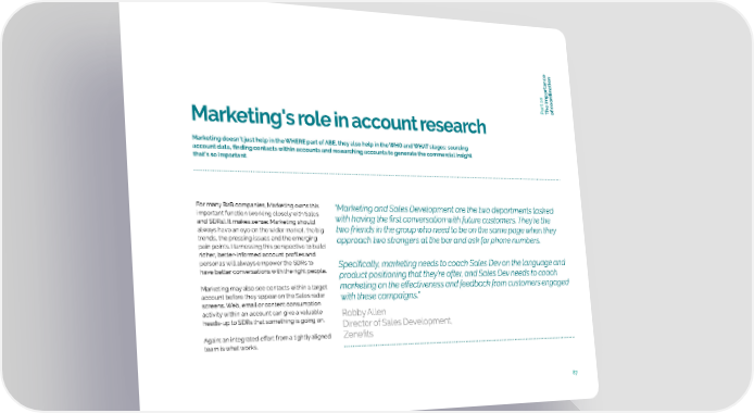 e tion dina oor art 10 c f P The importanco Marketing's role in account research Marketing doesn’t just help in the WHERE part of ABE, they also help in the WHO and WHAT stages: sourcing account data, finding contacts within accounts and researching accounts to generate the commercial insight that’s so important. For many B2B companies, Marketing owns this “Marketing and Sales Development are the two departments tasked important function (working closely with Sales with having the first conversation with future customers. They’re the and SDRs). It makes sense: Marketing should always have an eye on the wider market, the big two friends in the group who need to be on the same page when they trends, the pressing issues and the emerging approach two strangers at the bar and ask for phone numbers. pain points. Harnessing this perspective to build richer, better-informed account profiles and personas will always empower the SDRs to Specifically, marketing needs to coach Sales Dev on the language and have better conversations with the right people. product positioning that they’re after, and Sales Dev needs to coach Marketing may also see contacts within a target marketing on the effectiveness and feedback from customers engaged account before they appear on the Sales radar with these campaigns.” screens. Web, email or content consumption activity within an account can give a valuable Robby Allen heads-up to SDRs that something is going on. Director of Sales Development, Again: an integrated effort from a tightly aligned Zenefits team is what works. 87