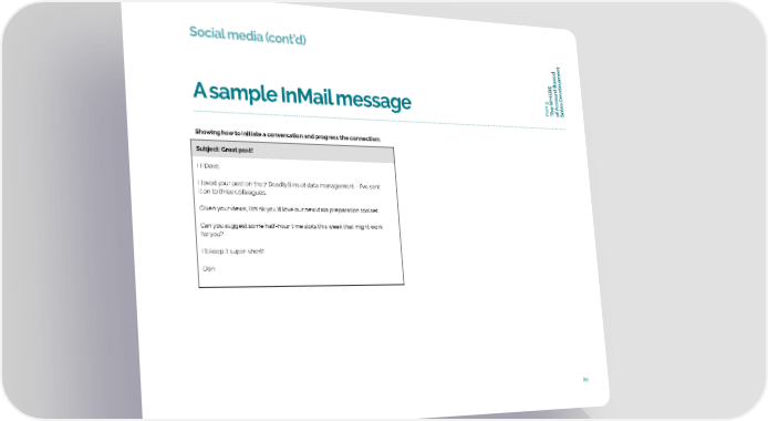 Social media (cont’d) t Based t elopmen v oun c c art 9 A f A sample InMail message PThe WHERE oSales De Showing how to initiate a conversation and progress the connection: Subject: Great post! Hi Dave, I loved your post on the 7 Deadly Sins of data management – I’ve sent it on to three colleagues. Given your views, I think you’d love our new data preparation toolset. Can you suggest some half-hour time slots this week that might work for you? I’ll keep it super-short! Don 80