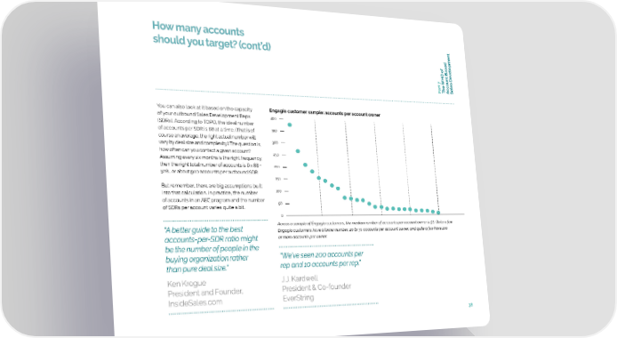 How many accounts t should you target? (cont’d) f o elopmen t Based v oun c art 7c P The WHO ASales De You can also look at it based on the capacity Engagio customer sample: accounts per account owner of your outbound Sales Development Reps 400 (SDRs). According to TOPO, the ideal number of accounts per SDR is 88 at a time. (That is of 350 course an average, the right actual number will vary by deal size and complexity.) The question is, 300 how often can you contact a given account? 250 Assuming every six months is the right frequency, then the right total number of accounts is 6 x 88 = 200 528… or about 500 accounts per outbound SDR. 150 But remember, there are big assumptions built into that calculation. In practice, the number 100 of accounts in an ABE program and the number 50 of SDRs per account varies quite a bit. 0 “A better guide to the best Across a sample of Engagio customers, the median number of accounts per account owner is 50. Quite a few Engagio customers have a lower number, 20 to 30 accounts per account owner, and quite a few have 100 accounts-per-SDR ratio might or more accounts per owner. be the number of people in the buying organization rather “We’ve seen 200 accounts per than pure deal size.” rep and 10 accounts per rep.” Ken Krogue J.J. Kardwell President and Founder, President & Co-founder InsideSales.com EverString 38