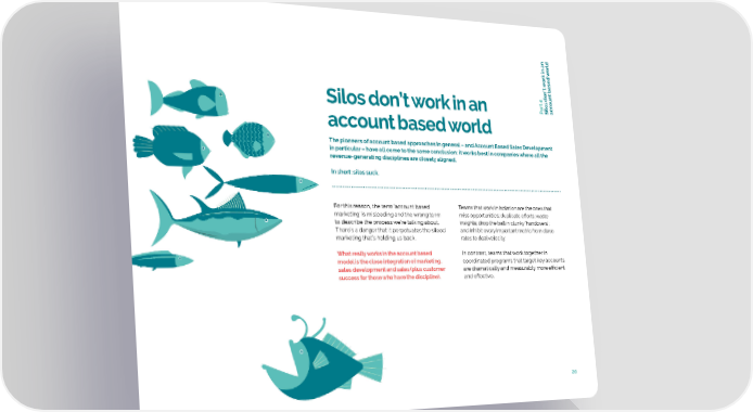 orld ork in an w ’t based w t oun art 4c Silos don’t work in an P Silos donac account based world The pioneers of account based approaches in general – and Account Based Sales Development in particular – have all come to the same conclusion: it works best in companies where all the revenue-generating disciplines are closely aligned. In short: silos suck. For this reason, the term ‘account based Teams that work in isolation are the ones that marketing’ is misleading and the wrong term miss opportunities; duplicate efforts; waste to describe the process we’re talking about. insights; drop the ball in clunky ‘handovers’; There’s a danger that it perpetuates the siloed and inhibit every important metric from close marketing that’s holding us back. rates to deal velocity. What really works in the account based In contrast, teams that work together in model is the close integration of marketing, coordinated programs that target key accounts sales development and sales (plus customer are dramatically and measurably more efficient success for those who have the discipline). and effective. 20