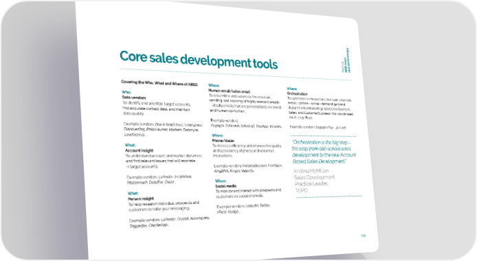 ools echnology art 13 Core sales development tools P SDR tand t Covering the Who, What and Where of ABSD: Where: Where: Human email/sales email Orchestration Who: To streamline and automate the creation, To synchronize interactions that span channels Data vendors sending, and tracking of highly relevant emails (email + phone + social + demand gen) and To identify and prioritize target accounts, – ideally emails that are personalized, reviewed, departments (Marketing, Sales Development, find accurate contact data, and maintain and human-to-human. Sales, and Customer Success) into coordinated data quality. multi-step Plays. Example vendors: Example vendors: Dun & Bradstreet, Leadspace, Engagio, Outreach, SalesLoft, ToutApp, Yesware… Example vendors: Engagio (Yep – just us!) DiscoverOrg, Email Hunter, Norbert, Datanyze, LeadGenius… Where: Phone/dialer “Orchestration is the big step – What: To increase efficiency and improve the quality the leap from old-school sales Account insight and consistency of phone and voicemail To understand account and market dynamics interactions. development to the new Account and find relevant issues that will resonate Based Sales Development.” in target accounts. Example vendors: InsideSales.com, FrontSpin, RingDNA, Ring.io, Velocify… Kristina McMillan, Example vendors: LinkedIn, InsideView, Sales Development Mattermark, DataFox, Owler… Where: Social media Practice Leader, What: To monitor and interact with prospects and TOPO Person insight customers via social channels. To help research individual prospects and customers to tailor your messaging. Example vendors: LinkedIn, Twitter, rFactr, Nudge… Example vendors: LinkedIn, Crystal, Accompany, Triggerfox, CharlieApp… 129